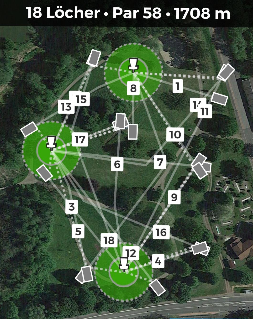 Da der Wunsch ebenfalls von der Stadt vorhanden ist, den Disc Golf Park ausschließlich im aktuell genutzten Bereich auf 18.000 Quadratmeter zu belassen, haben wir nun weitere Abwurfspots hinzugefügt, um eine vollständige 18-Loch-Anlage spielen zu können. So wurde der Parcours auch anspruchsvoller und schwieriger, da nun auch mehrere längere Par 4 Bahnen zu absolvieren sind.