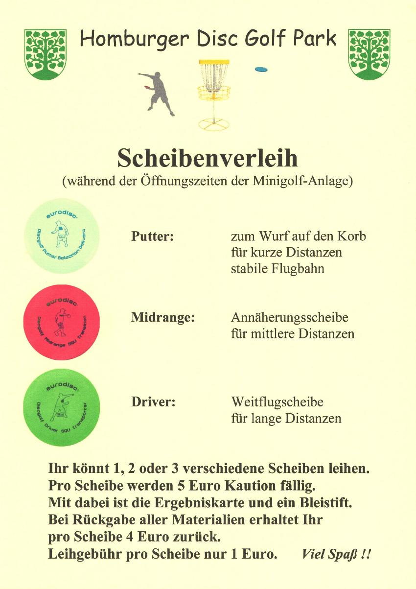 Ein Scheibenverleih ist zu den Öffnungszeiten der Minigolf-Anlage im Clubheim möglich. Mit freundlicher Unterstützung der Kleingolfer habt Ihr die Auswahl zwischen 3 verschiedenen Flugscheiben.
