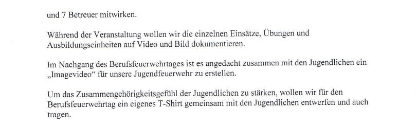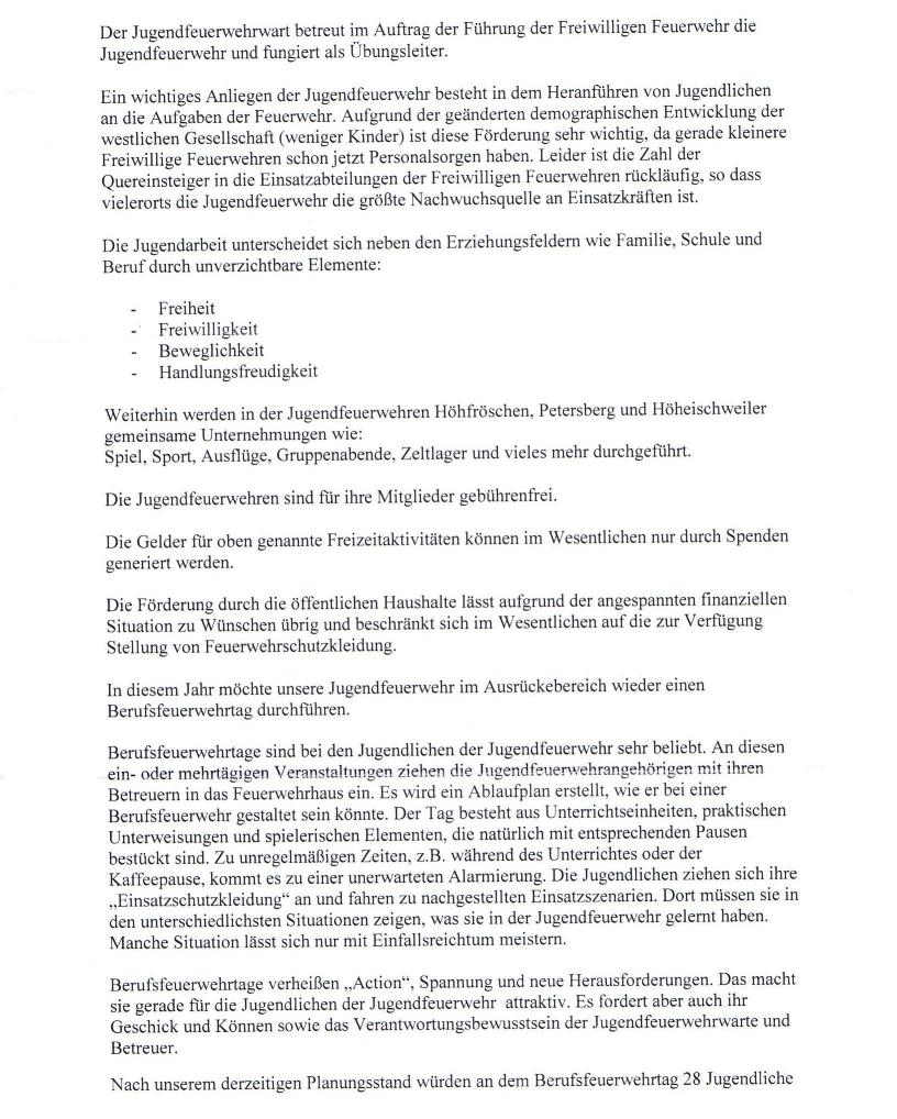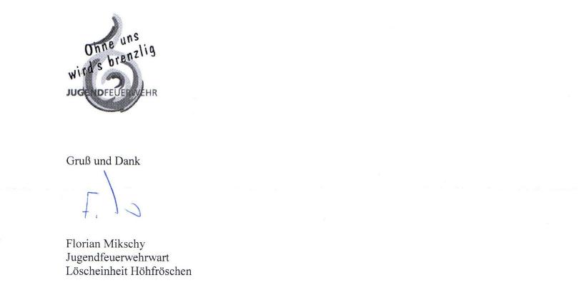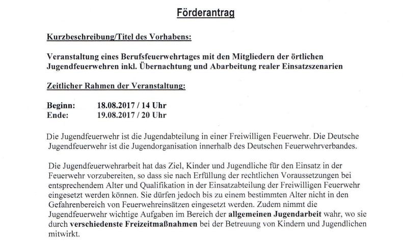 Nach Förderantrag des Jugendfeuerwehrwartes der Freiwilligen Feuerwehr Höhfröschen, kann für die geplante Veranstaltung am 18. und 19. August 2017 eine Projektförderspende in Höhe von 180 Euro zur Durchführung eines Berufsfeuerwehrtages mit den Mitgliedern der örtlichen Jugendfeuerwehren inkl. Übernachtung und Abarbeitung von realen Einsatzszenarien bereitgestellt werden.